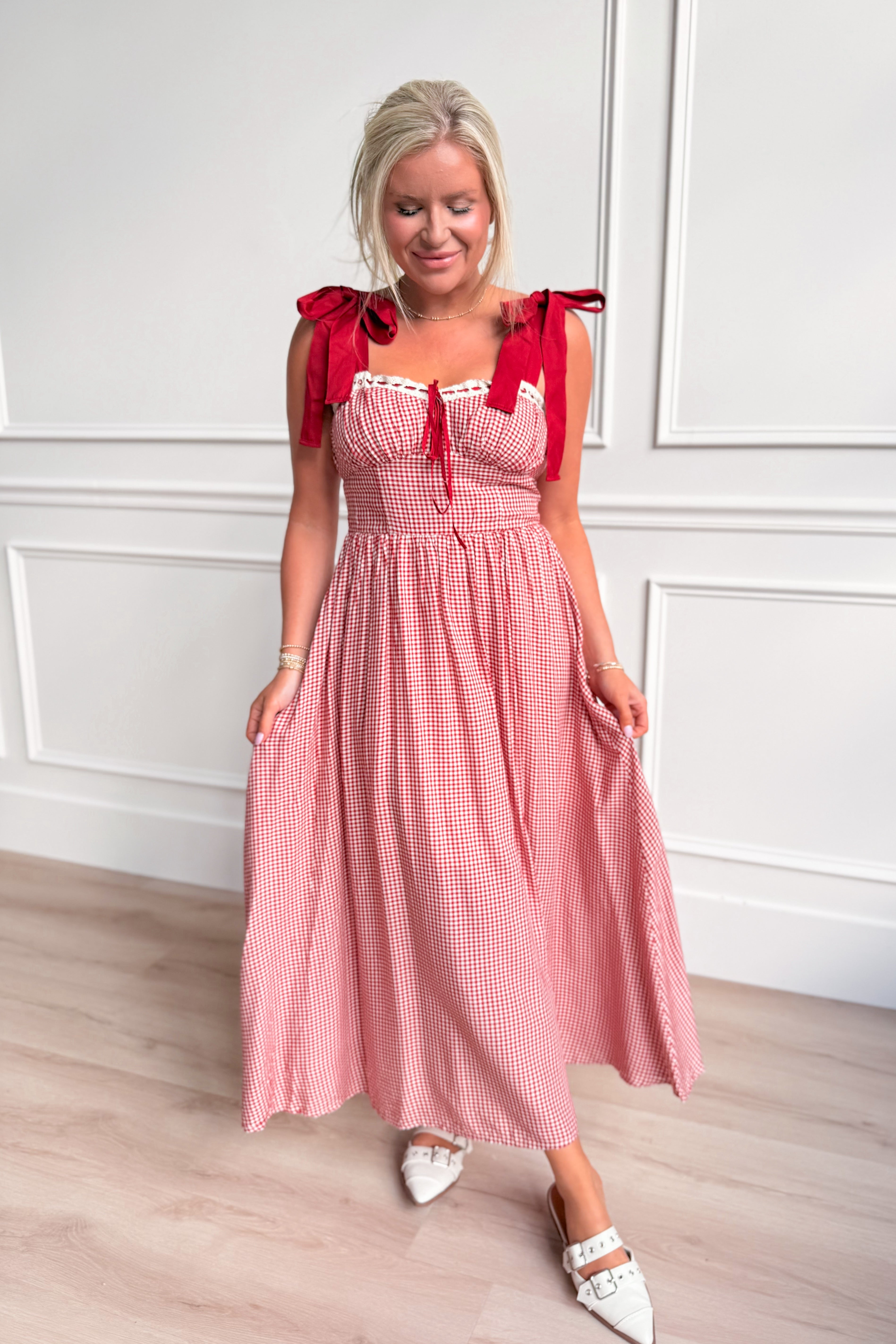 This sleeveless midi dress features a charming plaid pattern and delicate lace details that add a touch of whimsy. The sweetheart neckline and playful bow detail create a flirty, feminine silhouette perfect for any occasion where you want to stand out with sweet style.