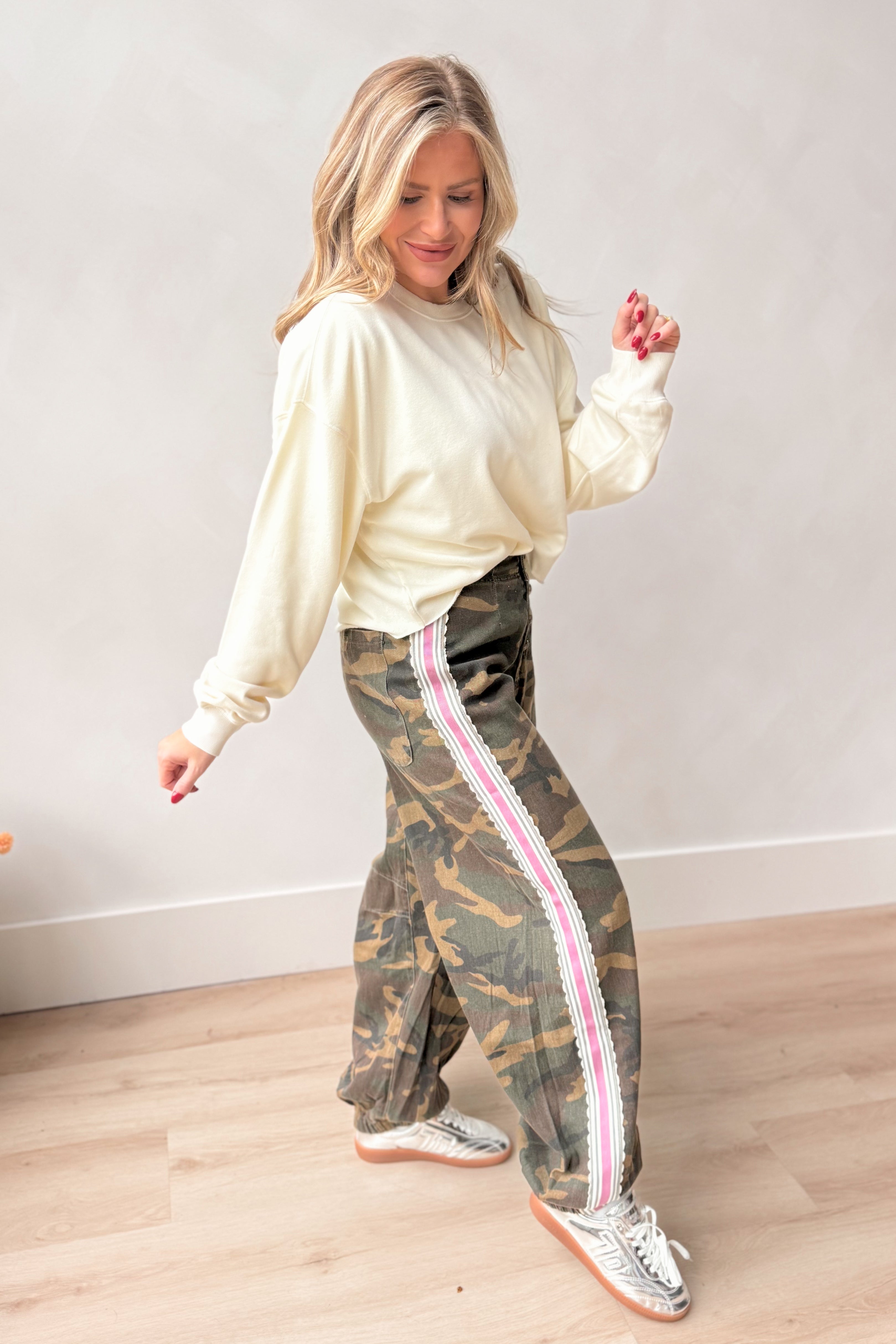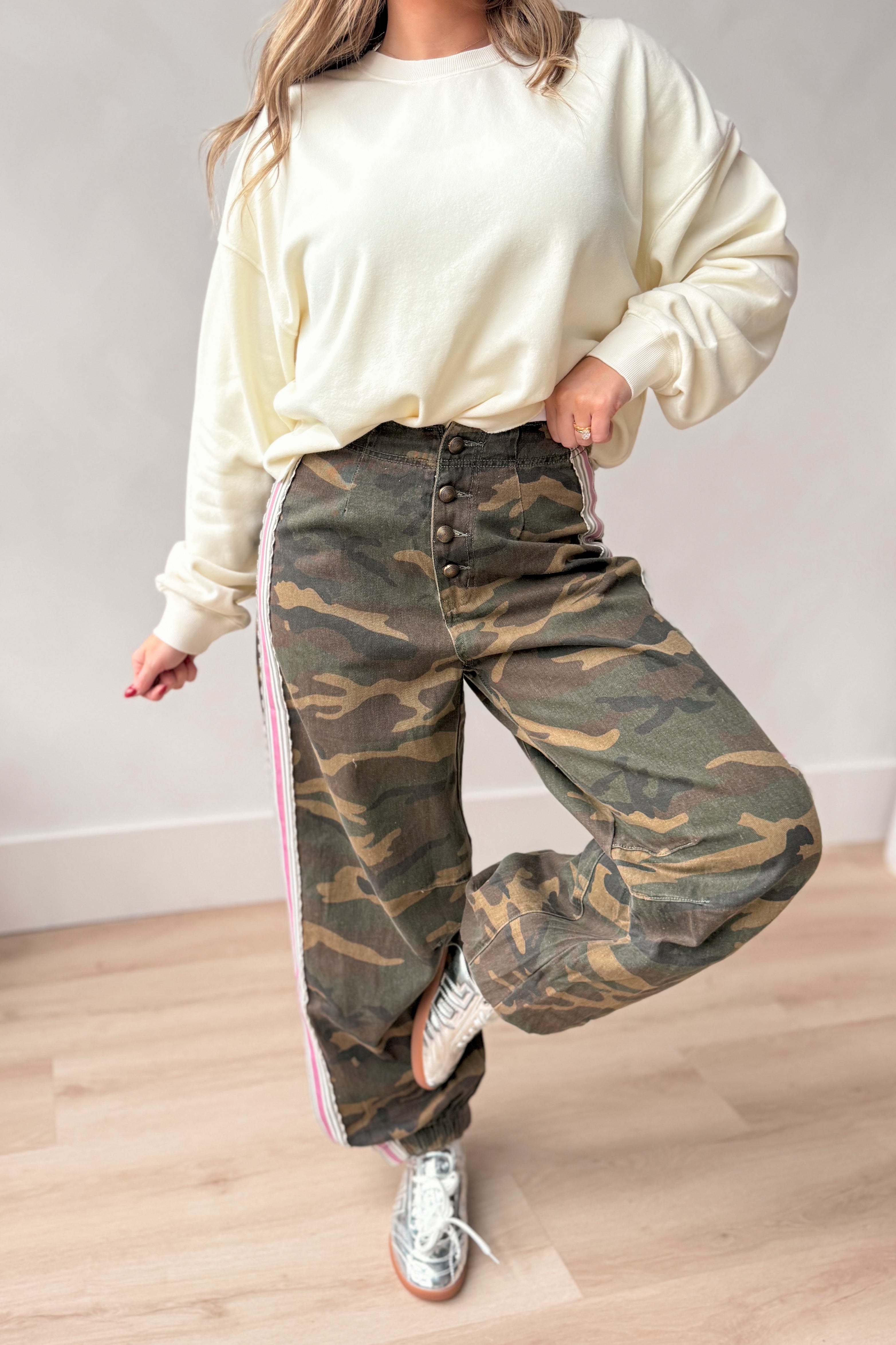 Step into statement style with the Andy Camo Side Striped Detail Pant by POL. This bold piece blends classic camo print with unexpected leopard accents and crisp side stripes for a look that's anything but ordinary. The relaxed wide-leg silhouette offers comfort without compromising on edge. Perfect for mixing prints or letting this beauty take center stage in your outfit.