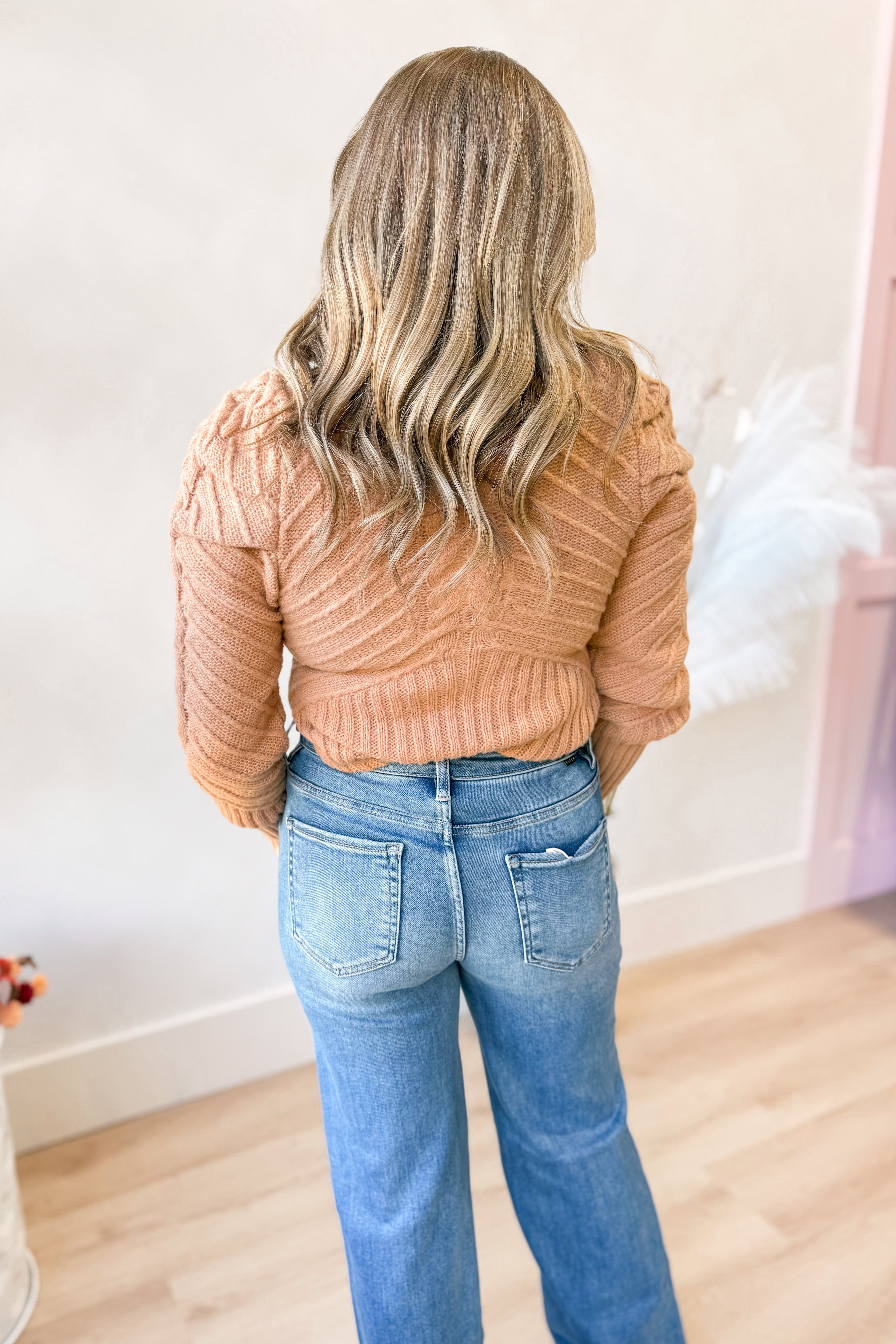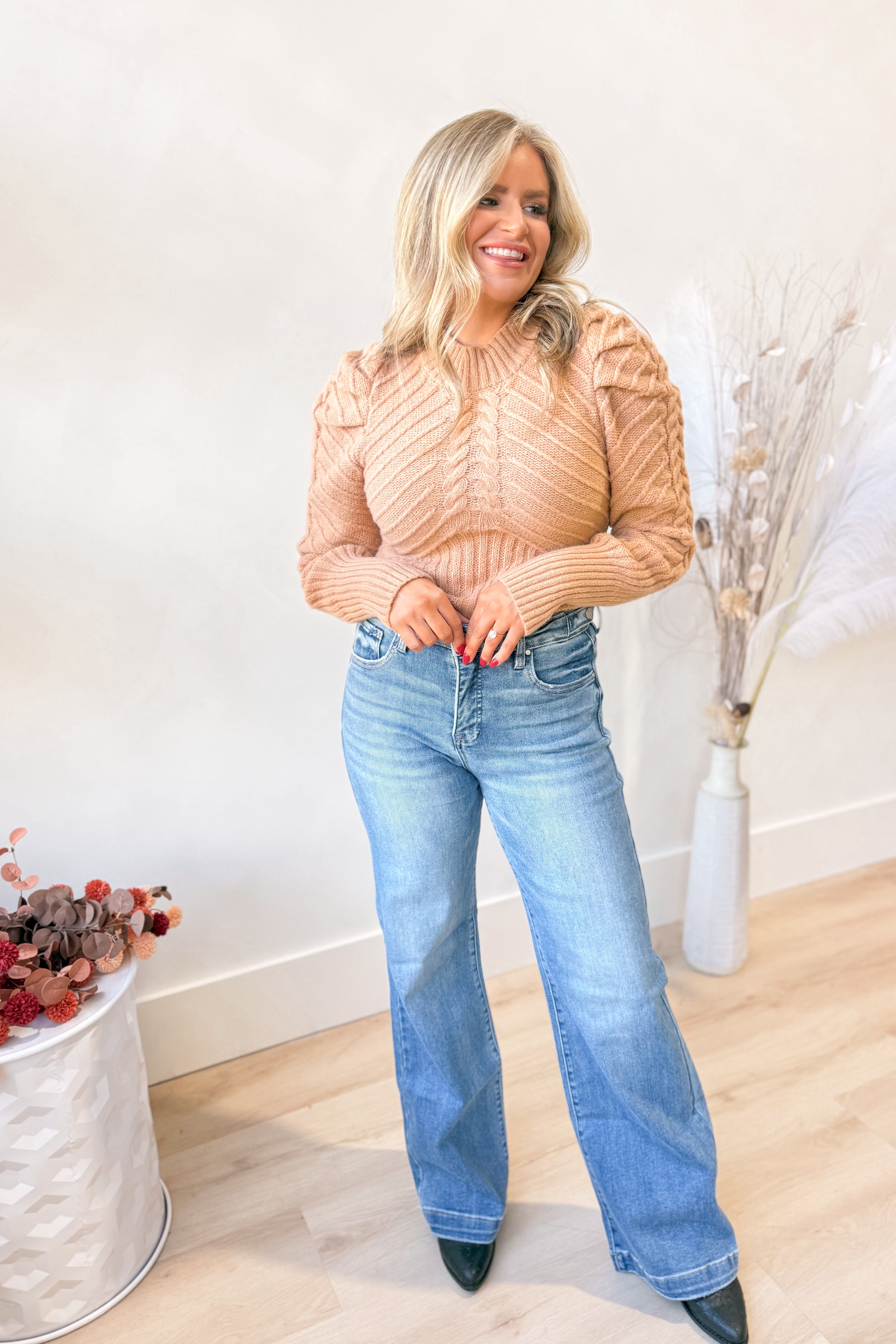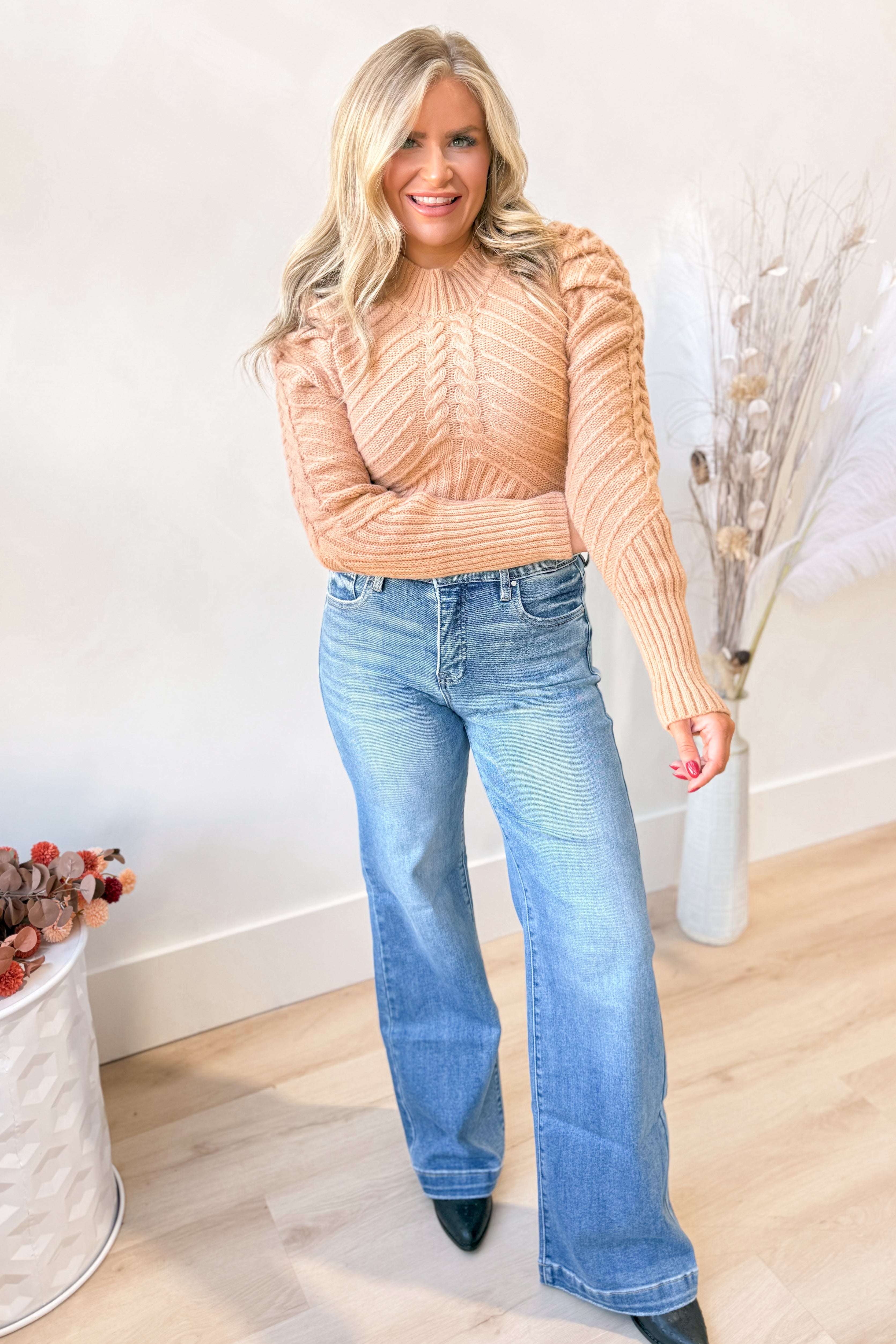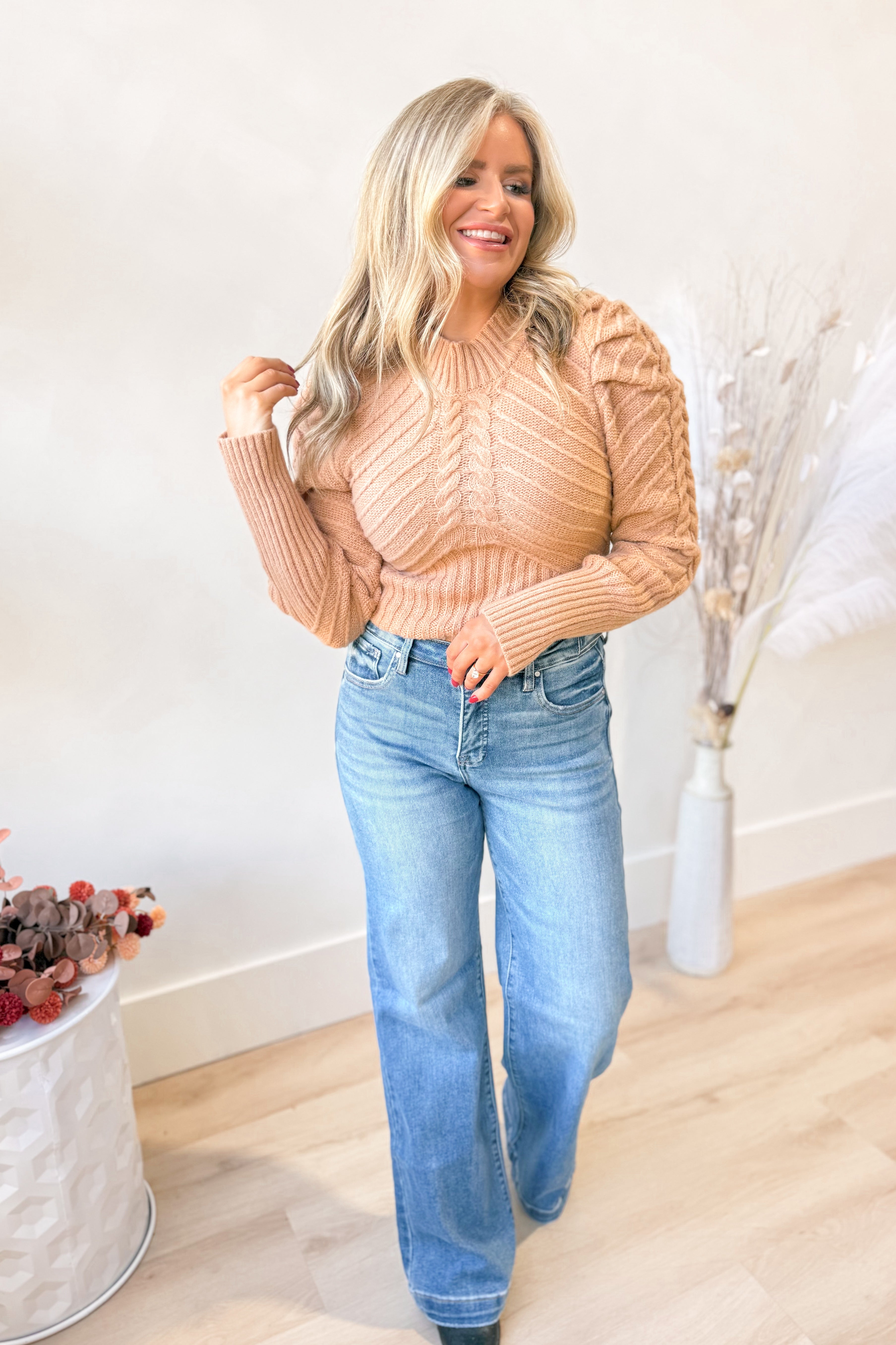 Stay stylish and cozy in the Darrin Mock Neck Puff Shoulder Sweater by &Merci. The mocha color adds a touch of sweetness to your look, while the ribbed mock neckline and cable knit detail bring texture. The long puff sleeves and gathered shoulder create a playful, yet chic look. (Sweater weather never looked so good!)