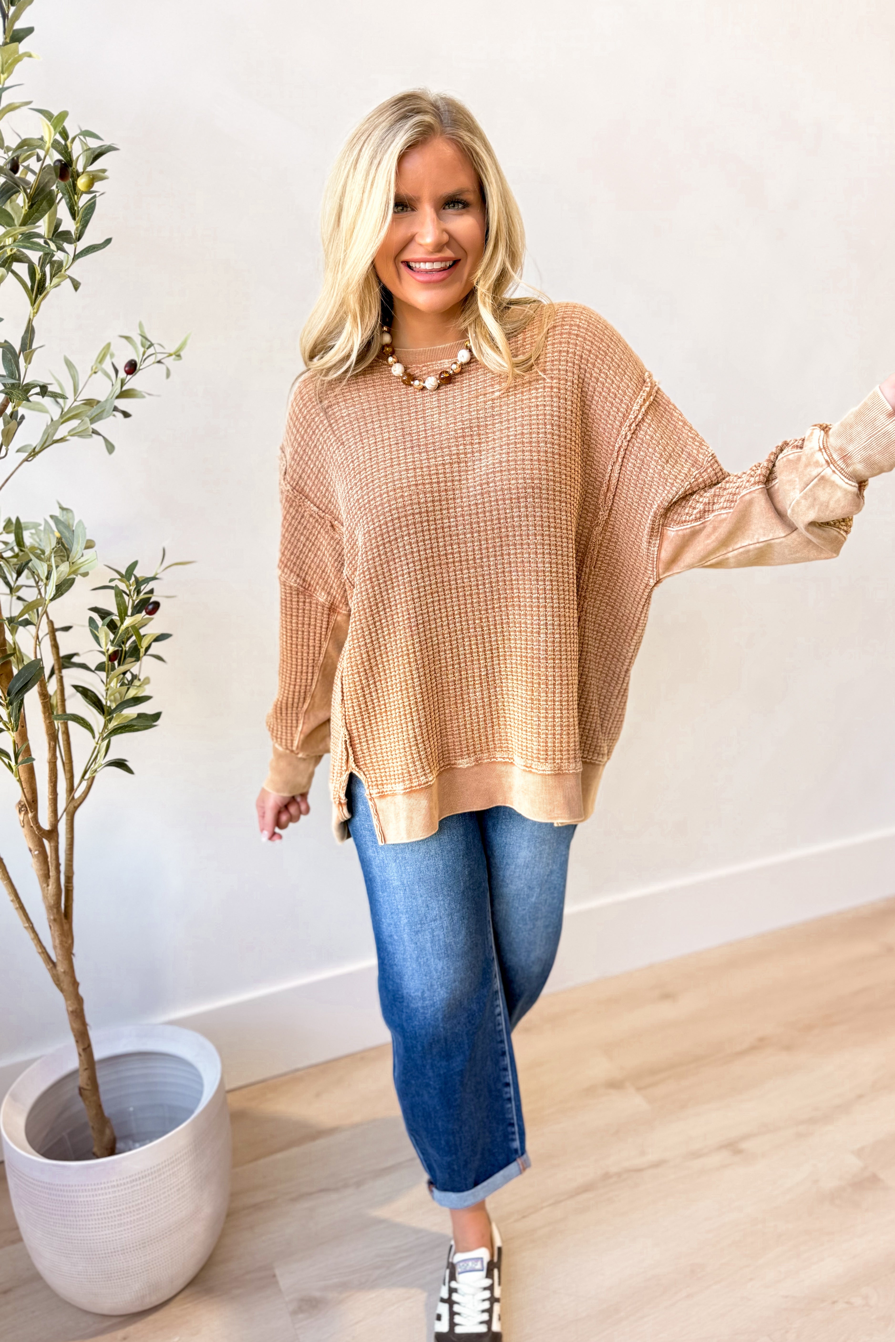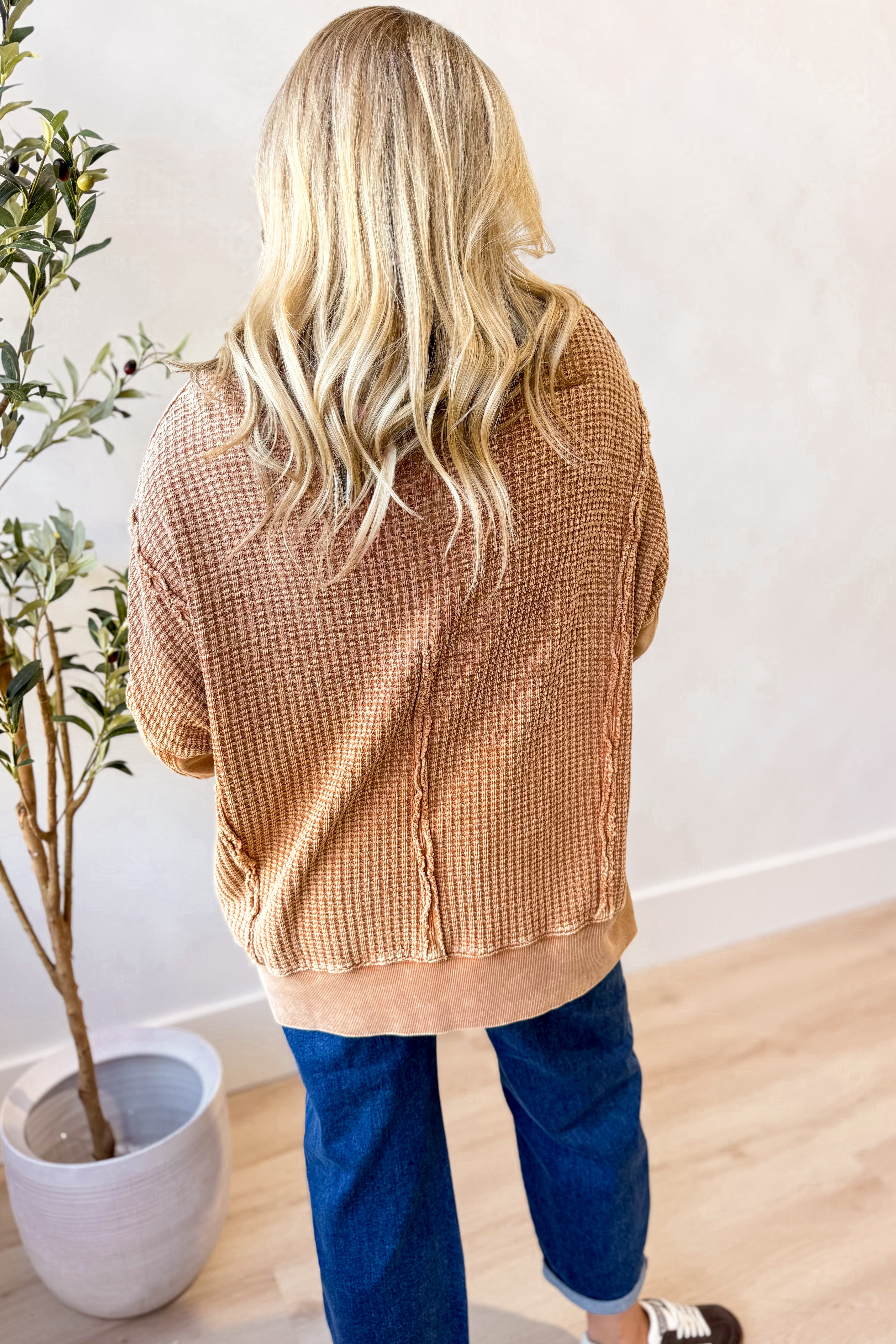 Cozy up in the Brooke Mineral Washed Thermal Pullover by Easel! Featuring a soft waffle knit and relaxed fit, this pullover offers all-day comfort with a playful vibe. The drop shoulder and scoop neckline add a trendy touch, making it perfect for layering or lounging in style.