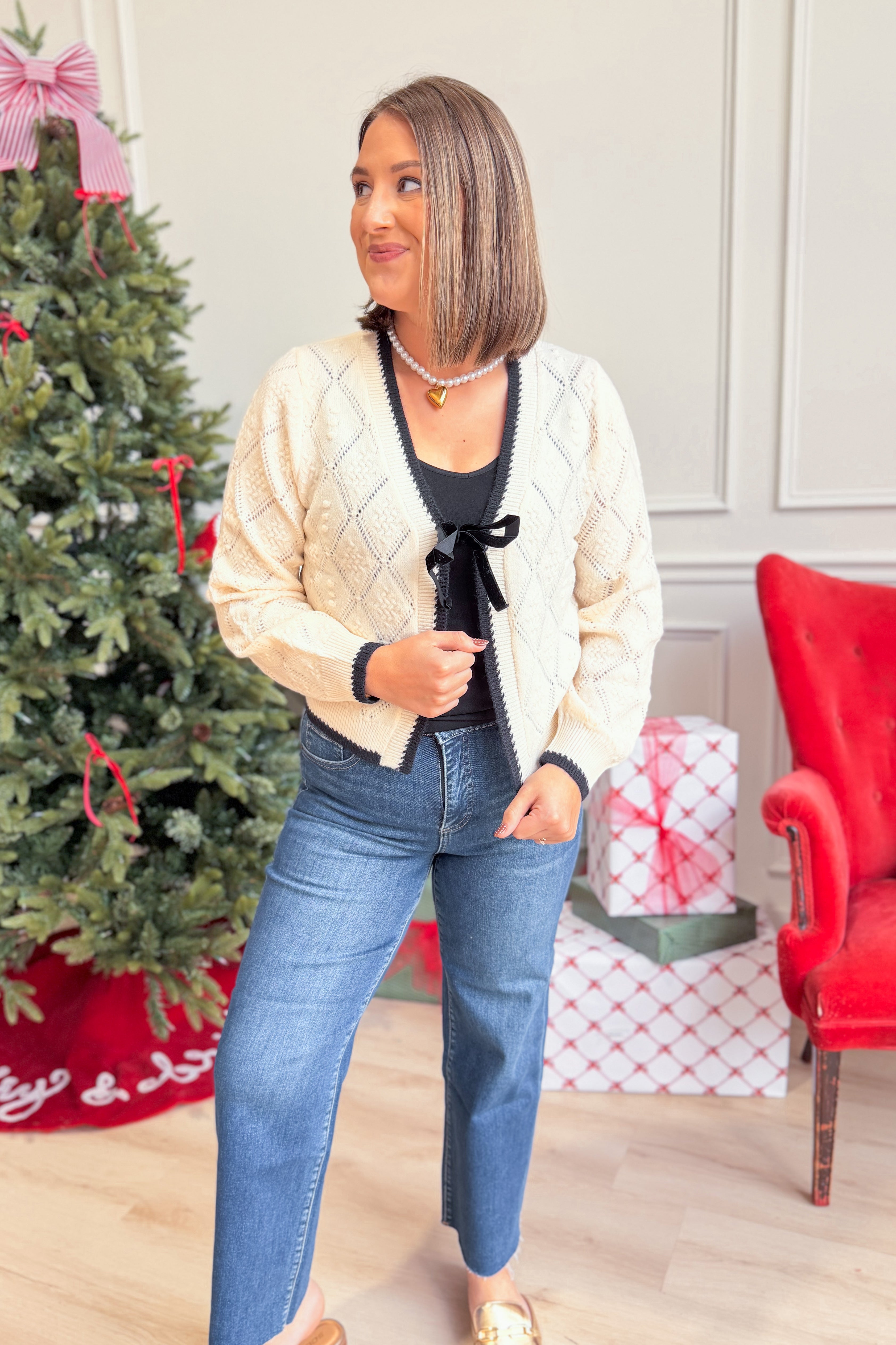This playful cardigan features a flattering V-neck and an open knit design that adds a breezy touch to your fall wardrobe. With long sleeves and solid trim, it balances cozy comfort and style perfectly. The tie-front detail brings a fun, flirty twist, making it easy to layer over your favorite tops for a chic, casual look.