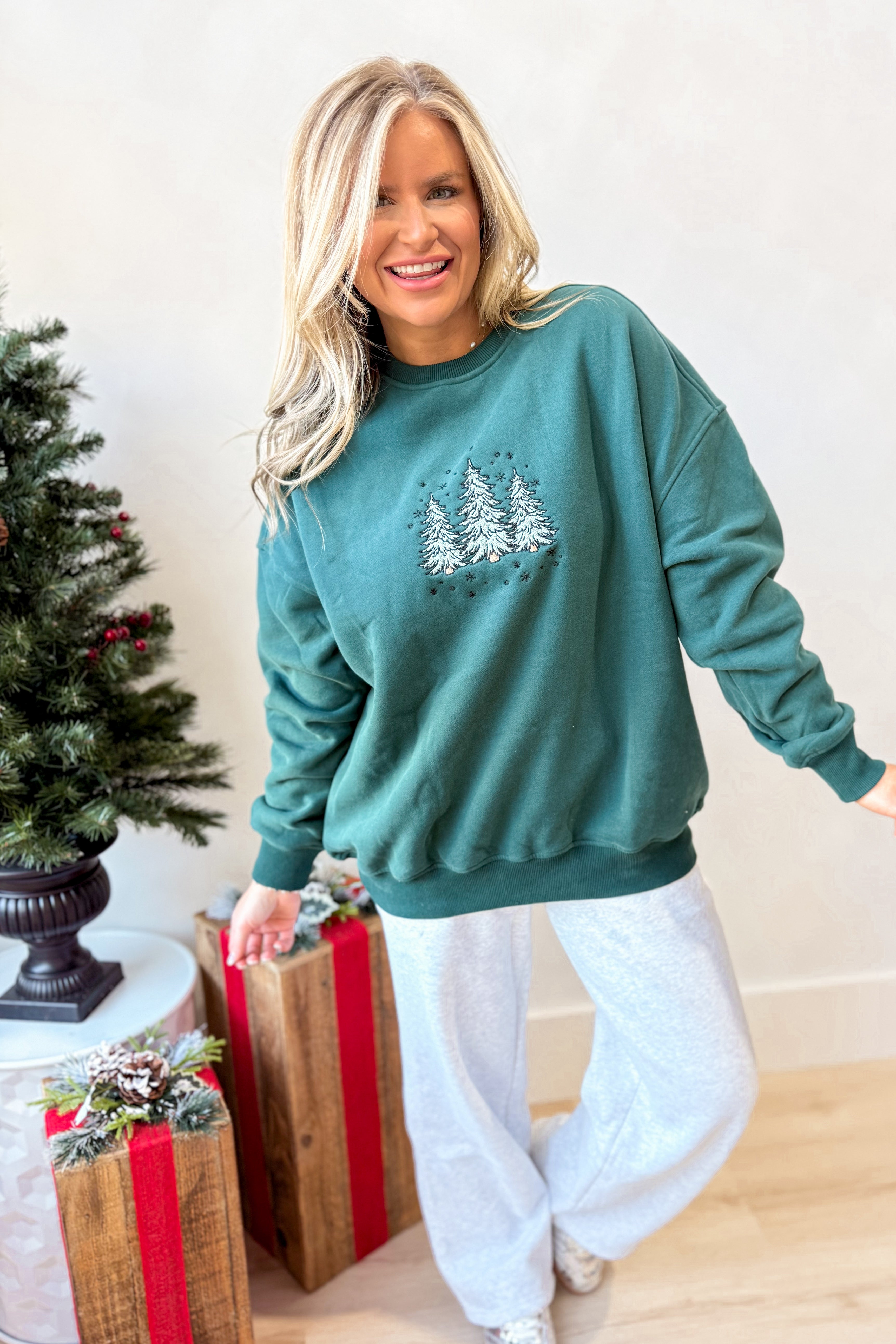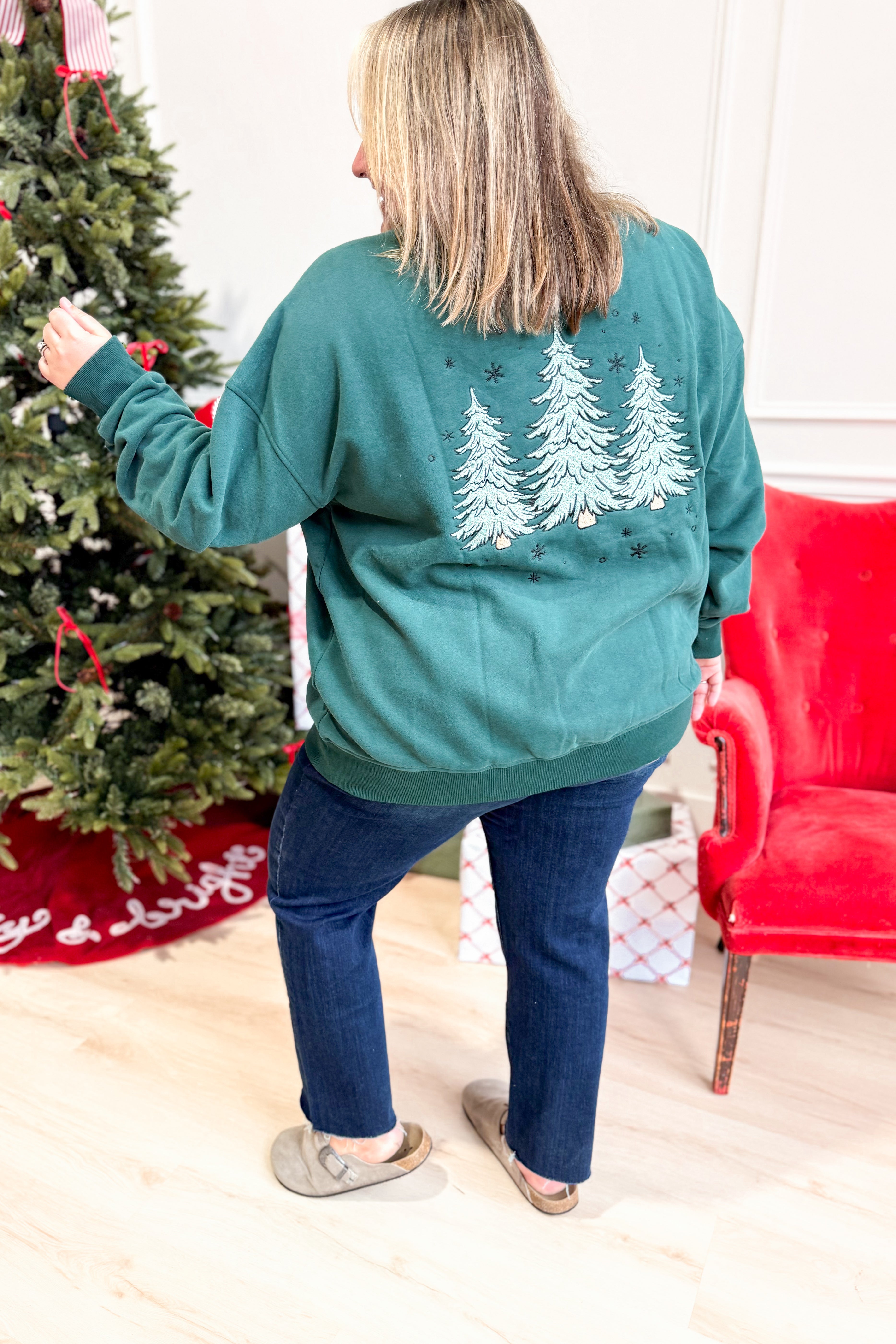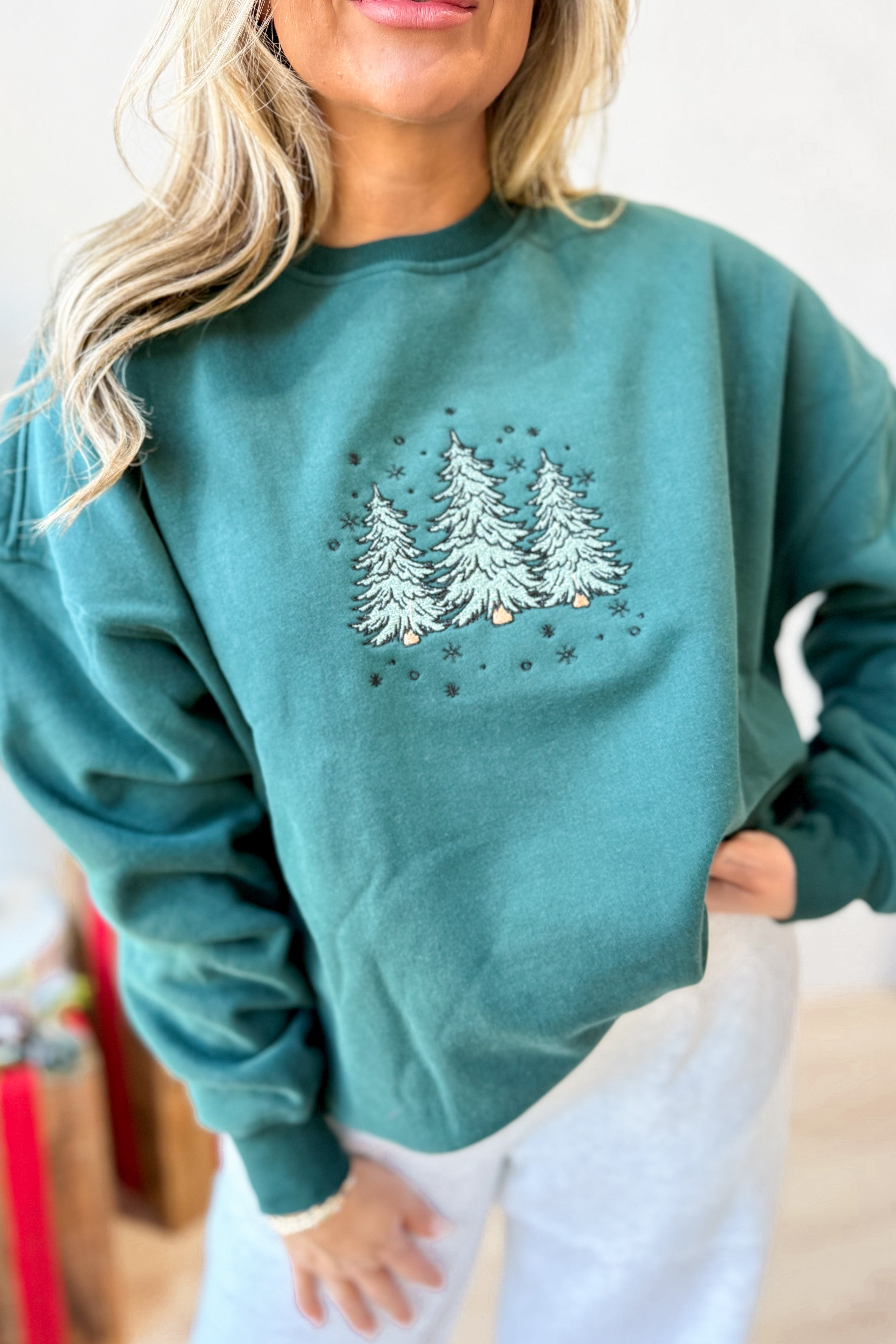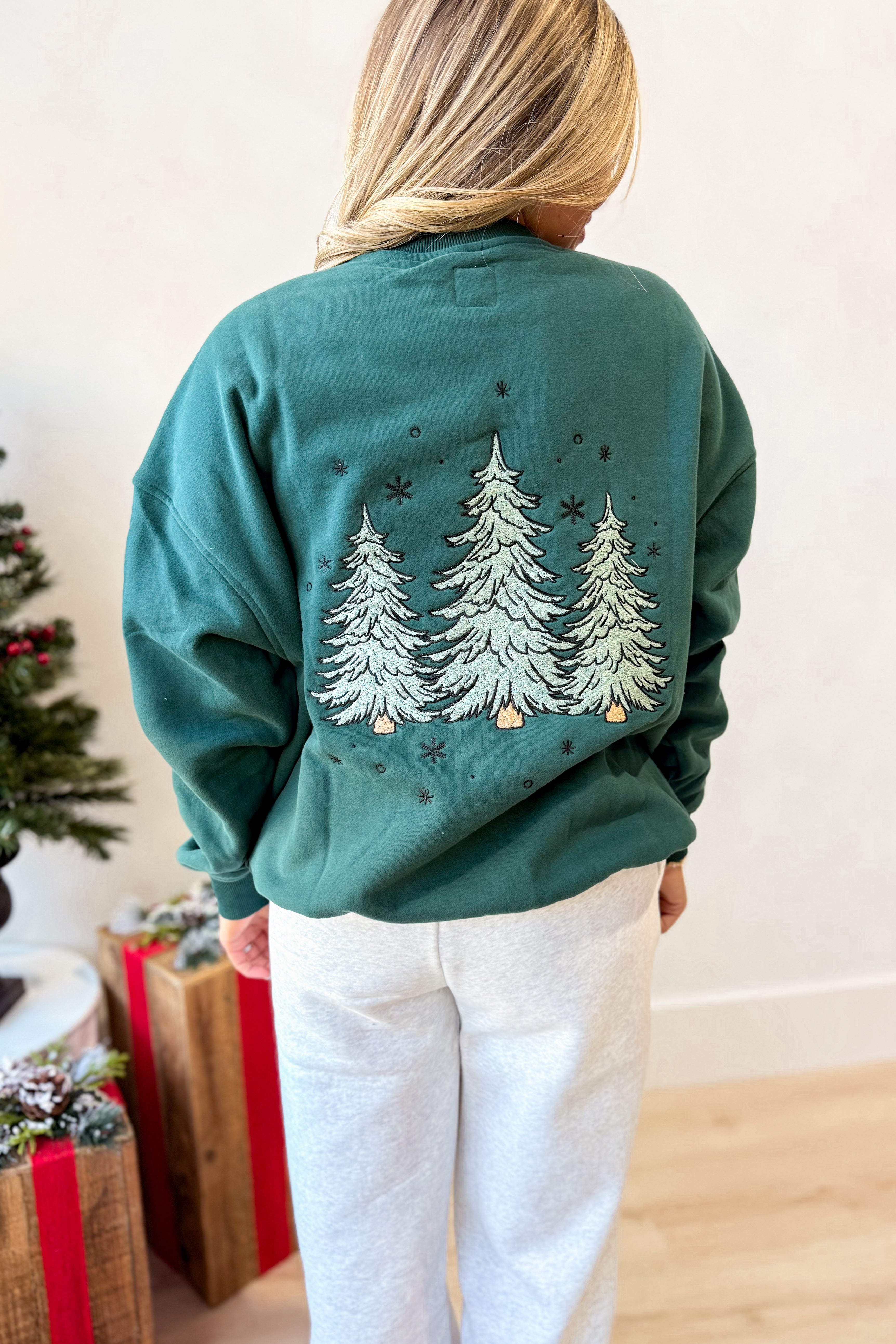 Celebrate the season in cozy style with this plush crewneck sweatshirt featuring charming embroidered Christmas trees. Its solid color and long sleeves make it perfect for chilly days, while the soft fabric keeps you comfy all day long. Get ready to spread holiday cheer with a playful touch!