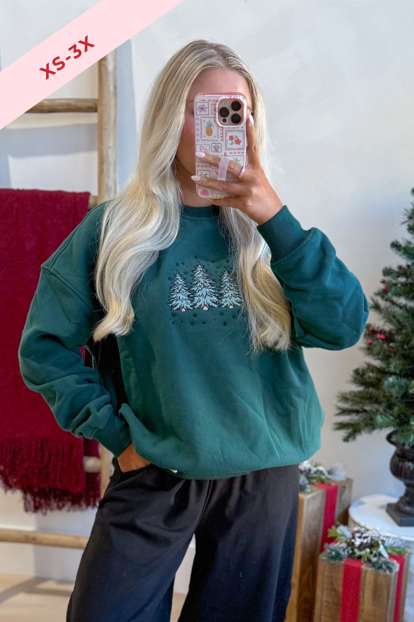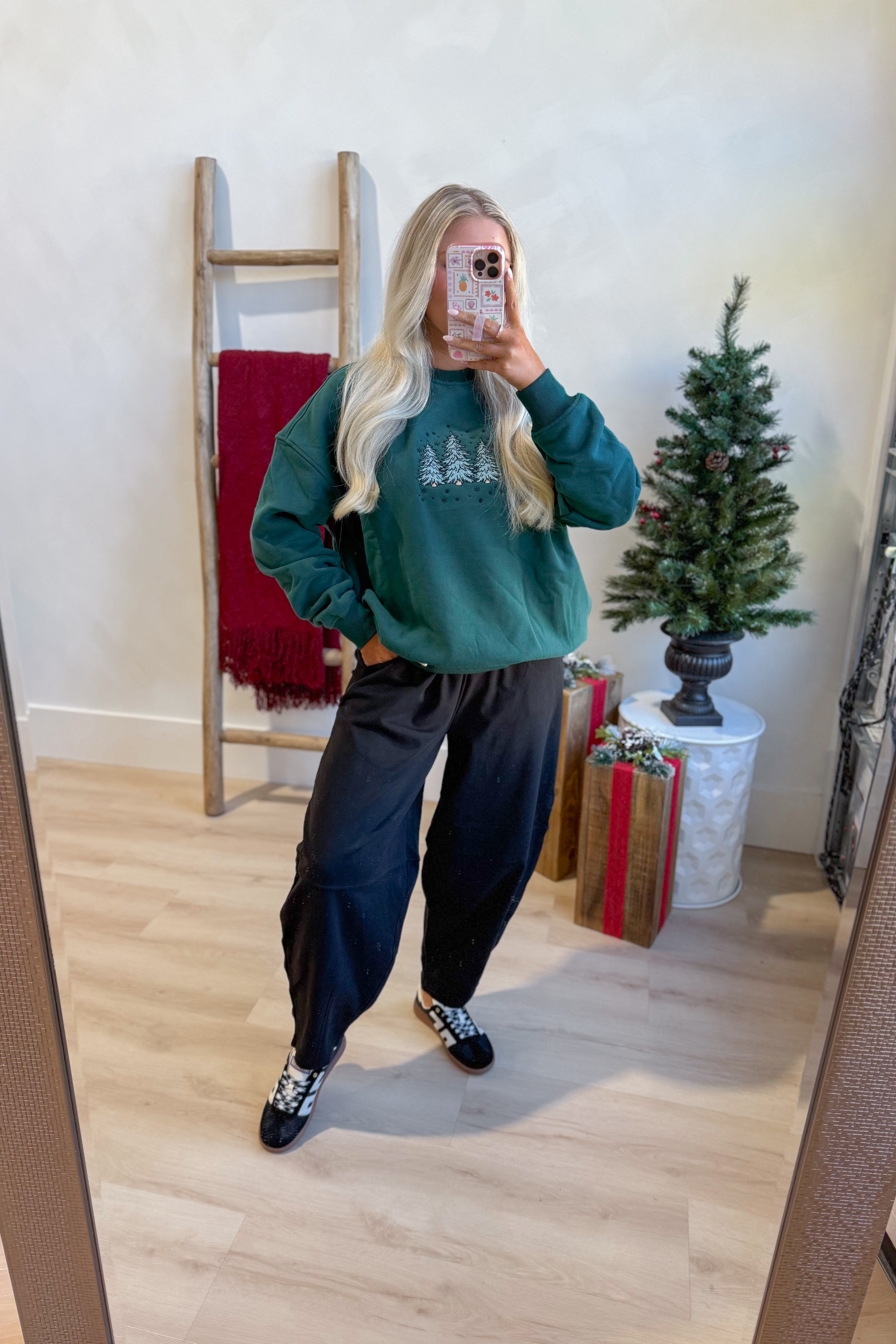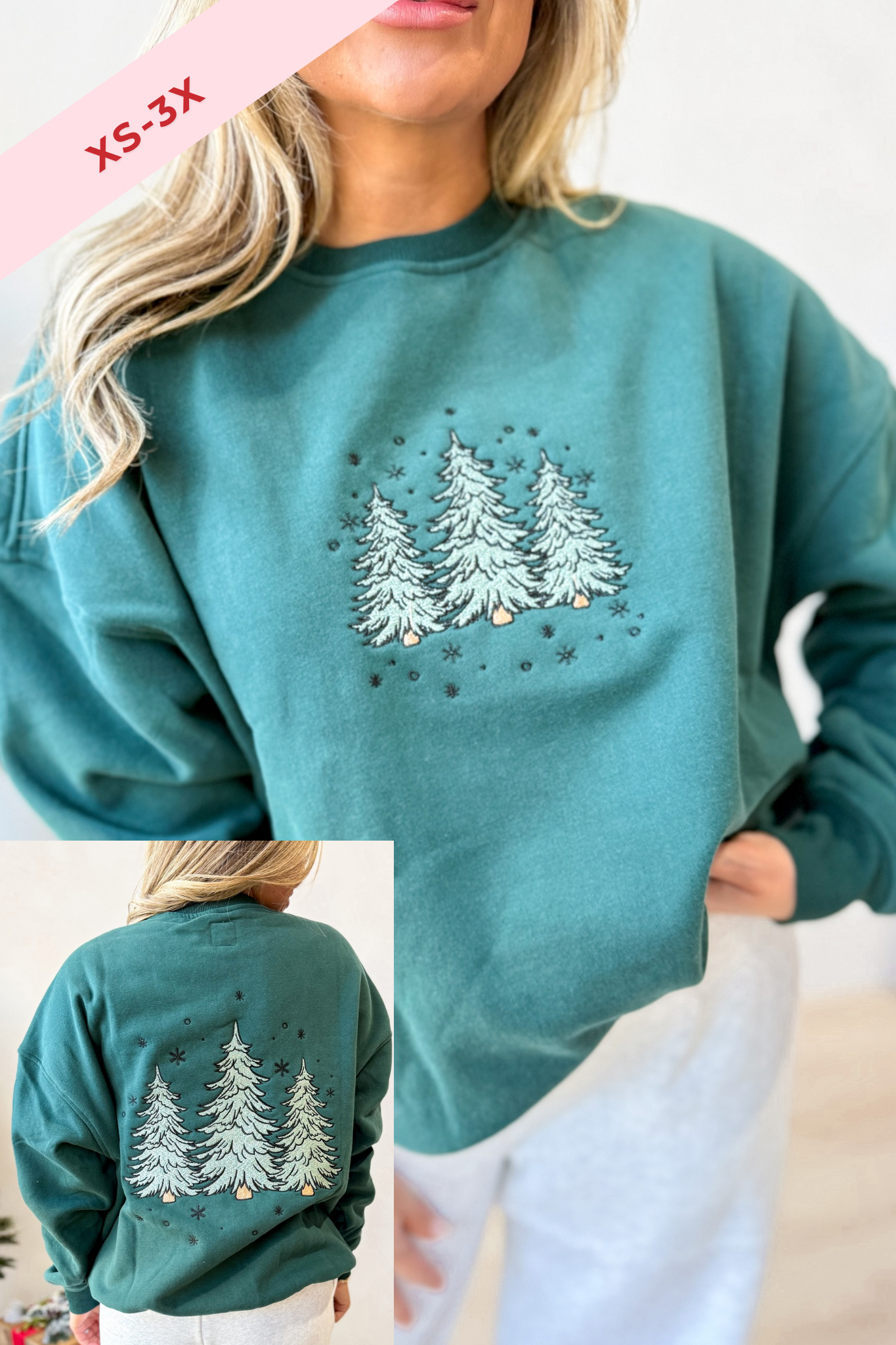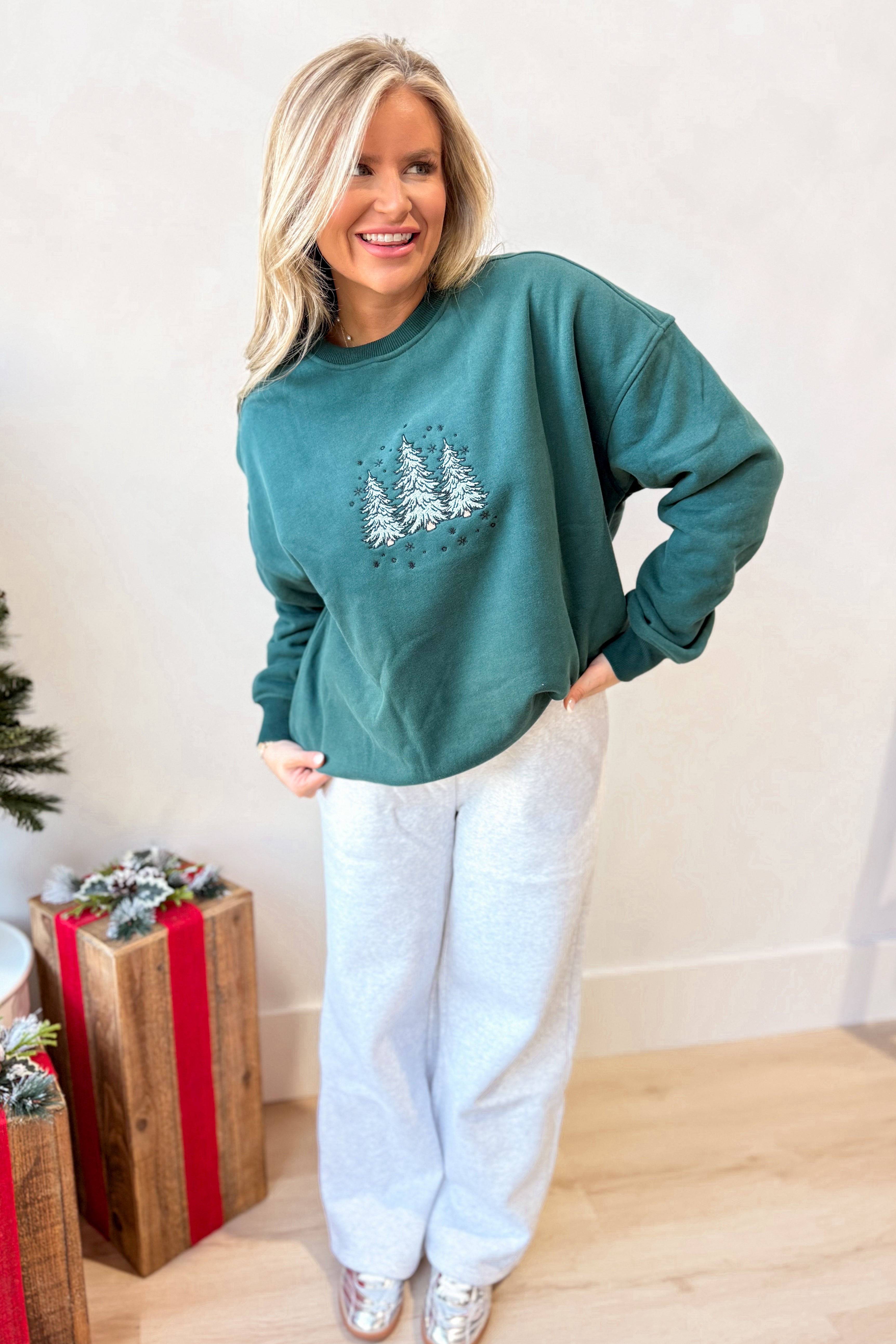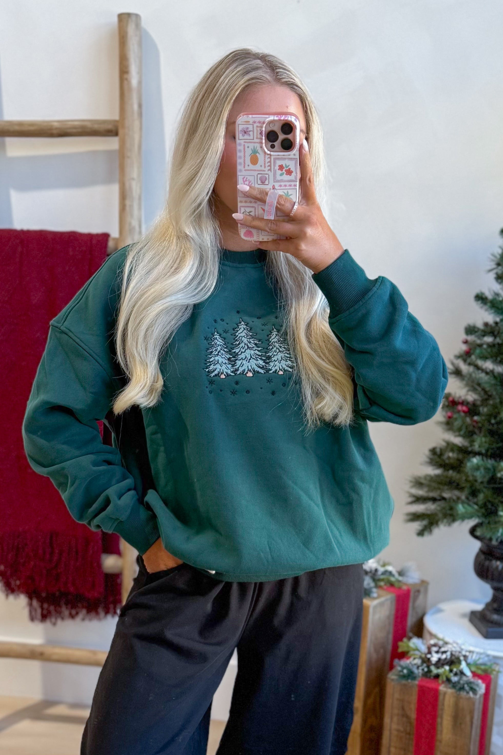 Celebrate the season in cozy style with this plush crewneck sweatshirt featuring charming embroidered Christmas trees. Its solid color and long sleeves make it perfect for chilly days, while the soft fabric keeps you comfy all day long. Get ready to spread holiday cheer with a playful touch!