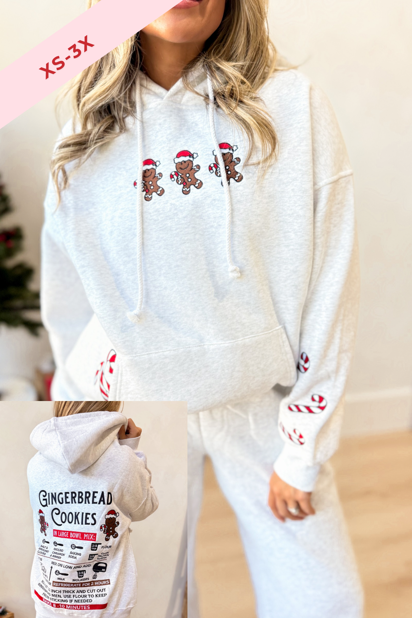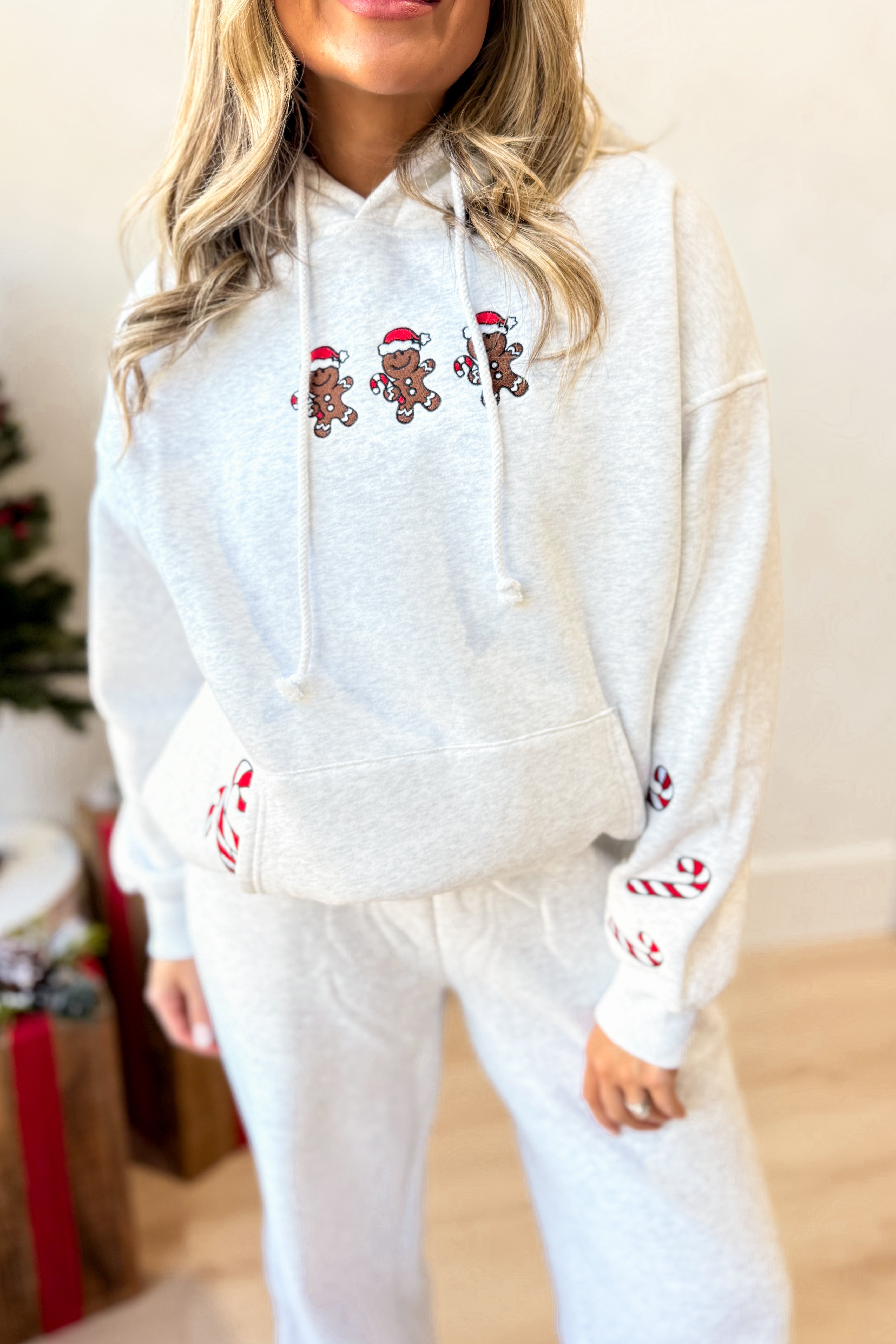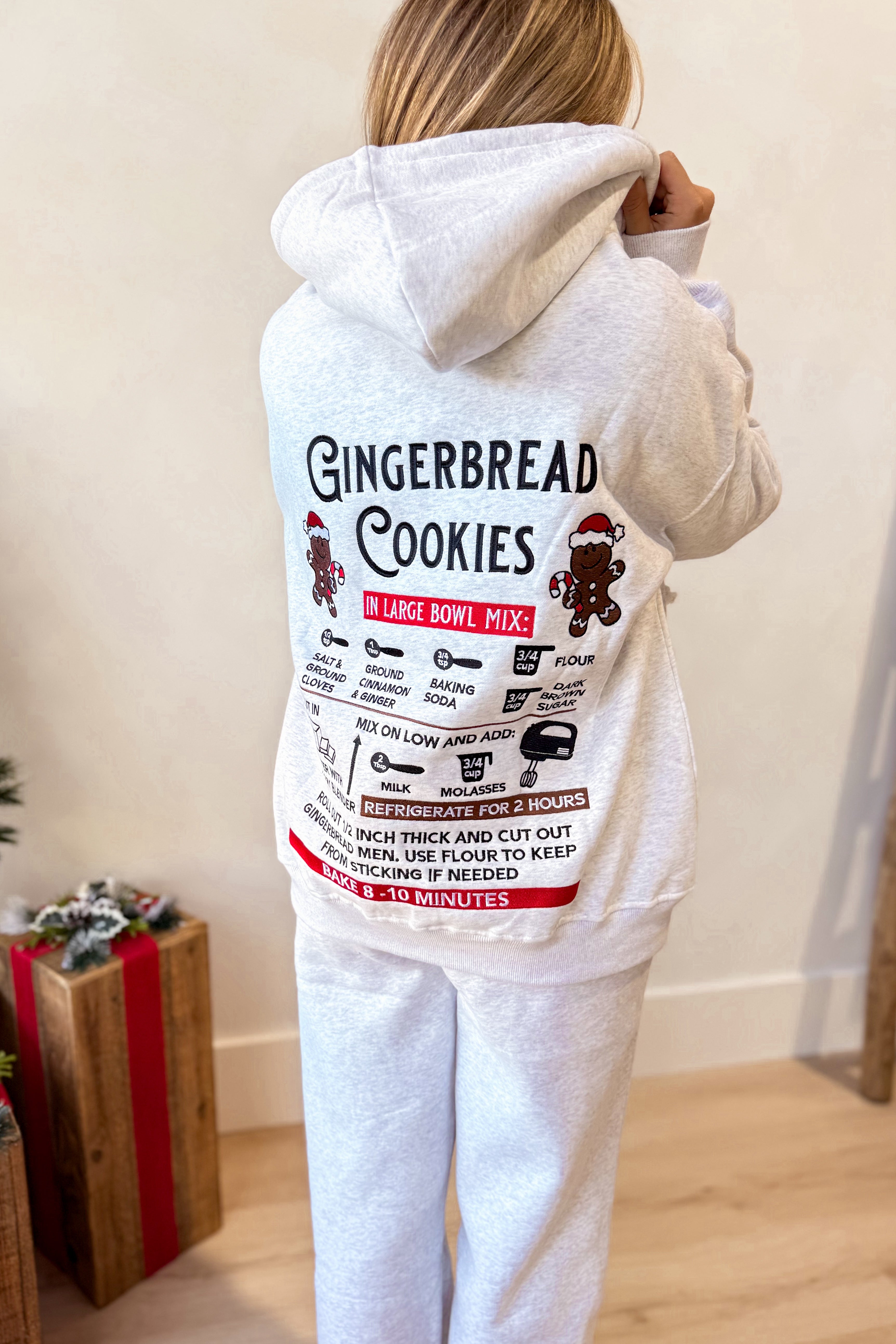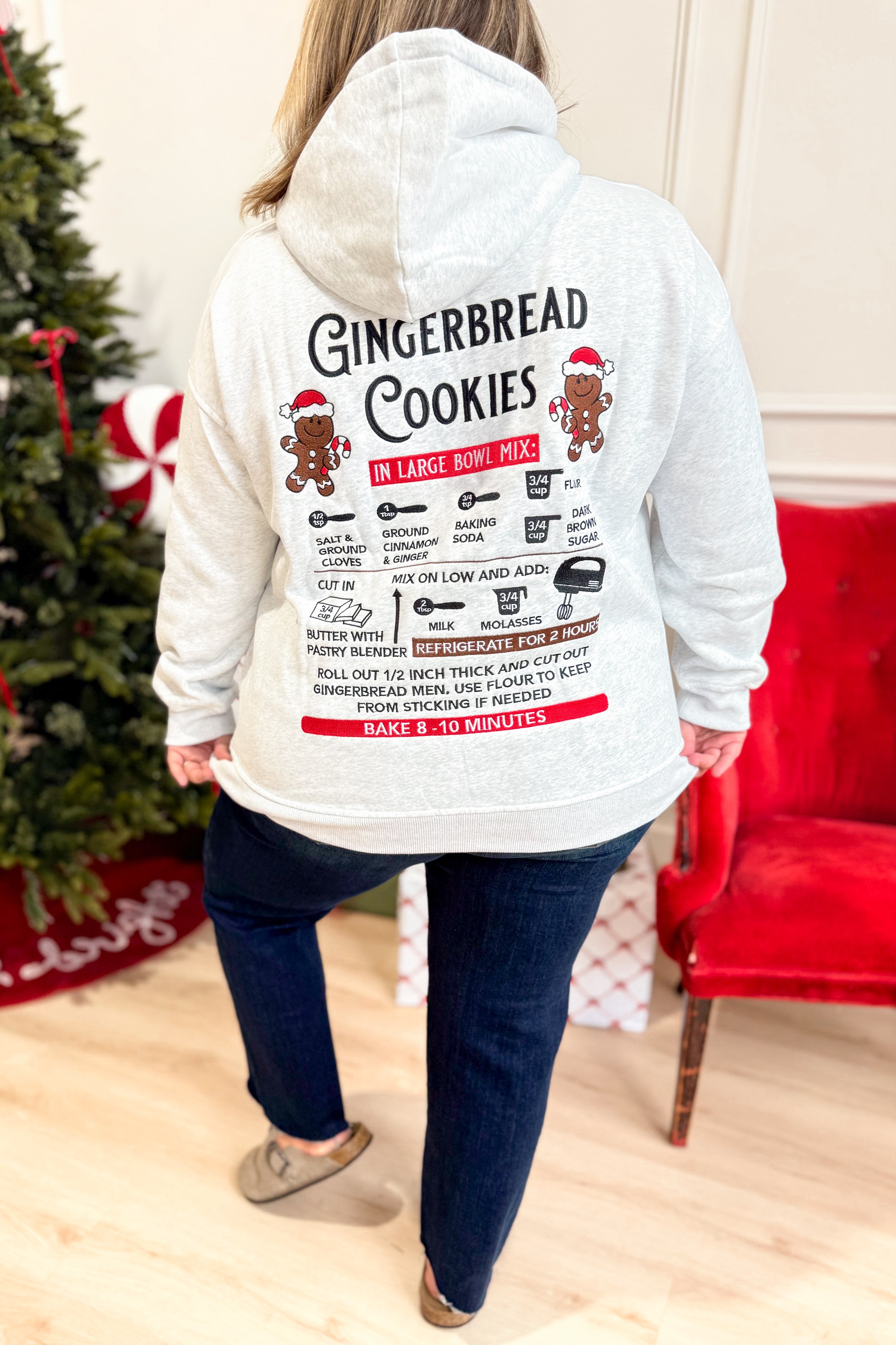 Get cozy in this playful hooded sweatshirt featuring a charming gingerbread cookie embroidery. With its solid color and long sleeves, it’s perfect for chilly days when you want to feel warm and festive. Whether you’re baking or just dreaming of sweet treats, this sweatshirt brings a sprinkle of holiday cheer to your everyday style.